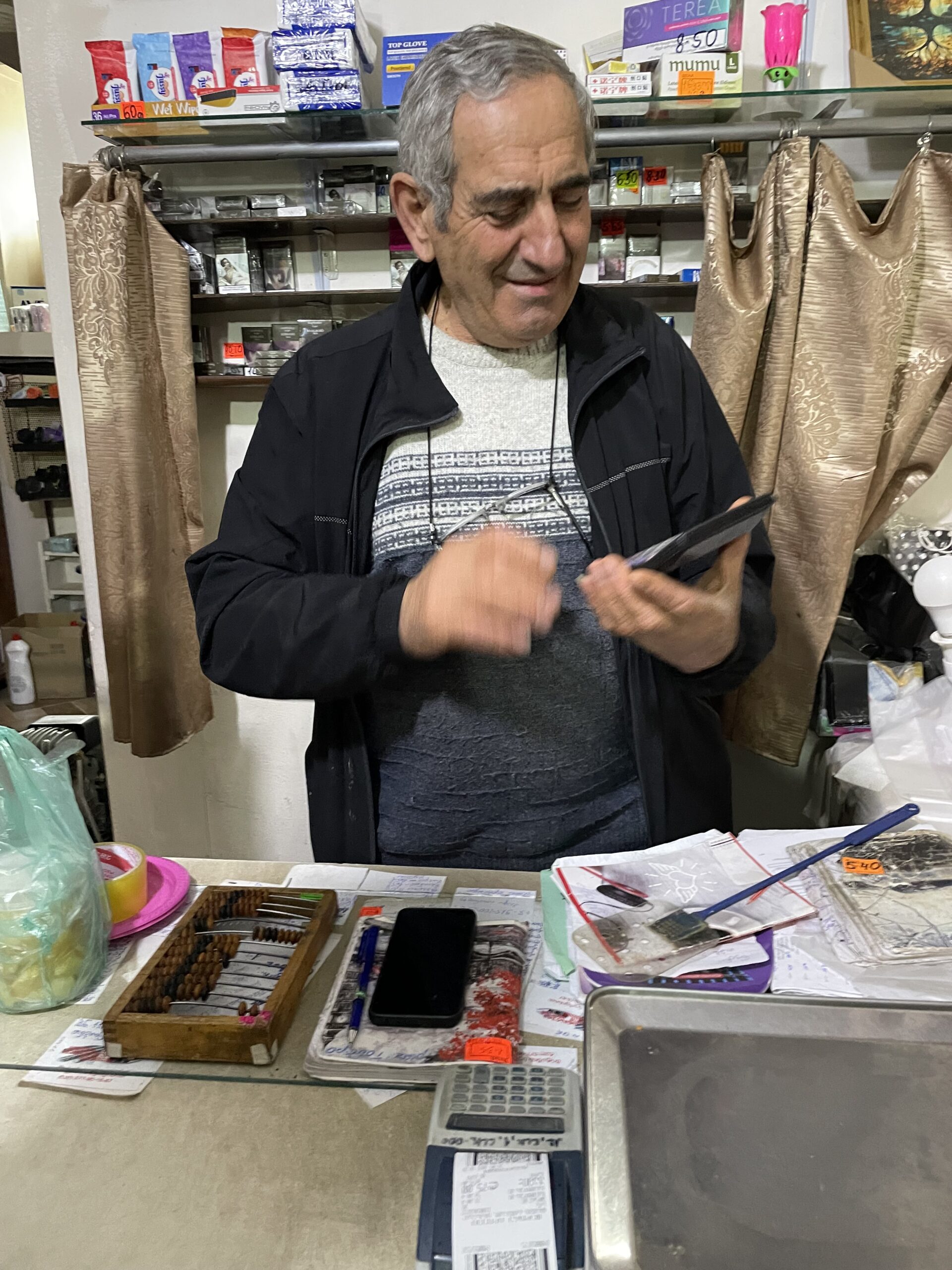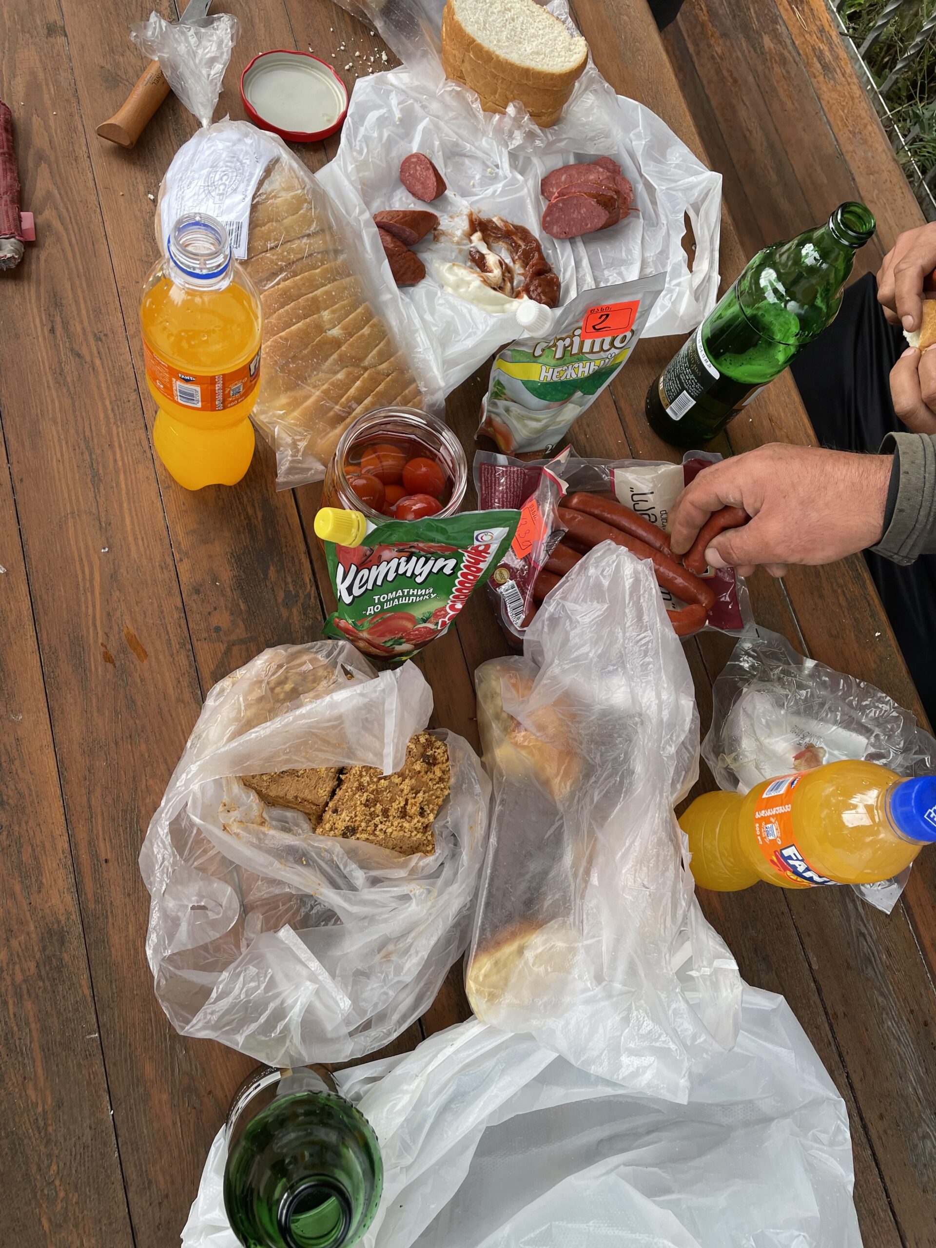 Back in the car, we drive off again in another direction and stop at a small building — a tiny shop, like the ones we’ll come to know so well in the coming weeks. Reso buys sausage, bread, and something from the fridge. Cacha asks if Olivier wants a beer. We have no idea what the plan is, so we buy some pastries to share in return. We pay the old man behind the counter, who calculates the price on an abacus. When he sees we don’t understand, he switches to a calculator.